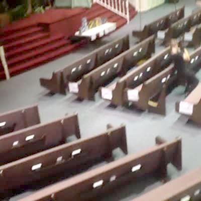 A man tries to swing from a balcony at a church, and forcefully runs into a pew.