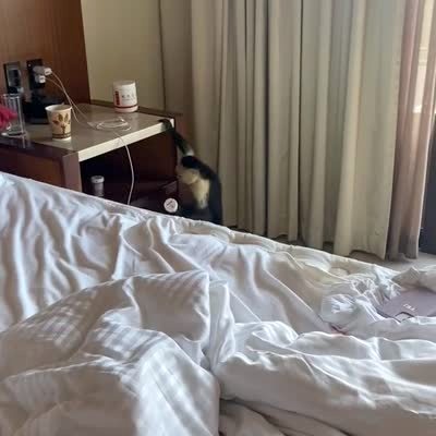 A monkey is an a hotel bedroom. He grabs a bottle of medicine and runs out onto the balcony and jumps onto a tree with it.