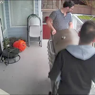 Two men carry a grill down a stair case, and the man on the top of the staircase drops the grill on himself and the grill falls on the man on the bottom and they hit the floor. Security Footage