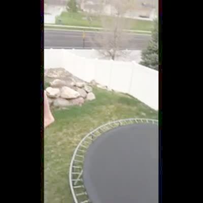 A teen boy jumps off a second story balcony, lands on a trampoline and does a flip, then loses his balance and falls against a fence in the backyard.
