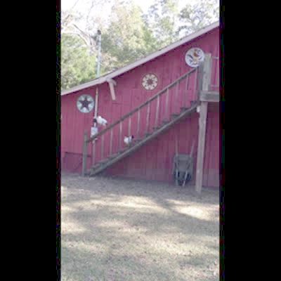 A man follows two dogs down some wooden steps when the stairway collapses and he falls through them. He recovers, stands up and walks away. Security footage.