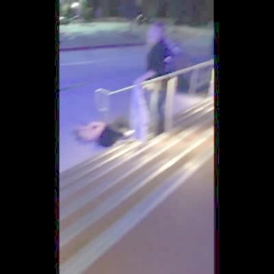 Drunk woman falls on porch stairs while acting goofy and pulls railing off with her. Shot at night.