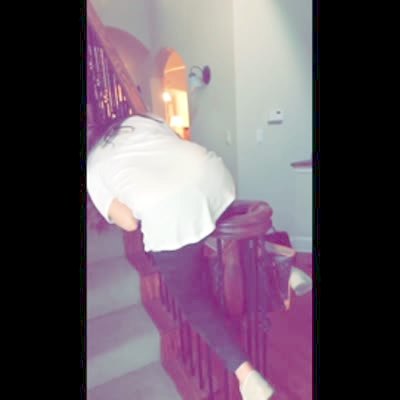 A young woman tries to slide down a banister and her friend pulls her shirt off as she goes down.