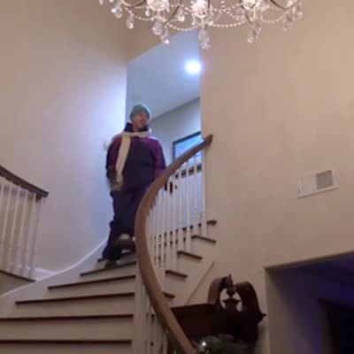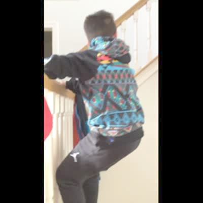REDUB WITH MORE FOOTAGE: Cat jumps up, slides down stairs banister by hanging off with his paws & he lands in a laundry basket.
