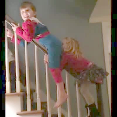 A tot girl slides down a staircase banister handrail but her young boy brother slides down and his bottom hits her face and their family laughs.