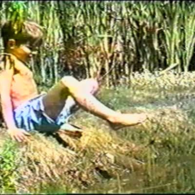 A man in a boat on a lake catches a fish with his bare hands and two young girls scream until he drops it back in.