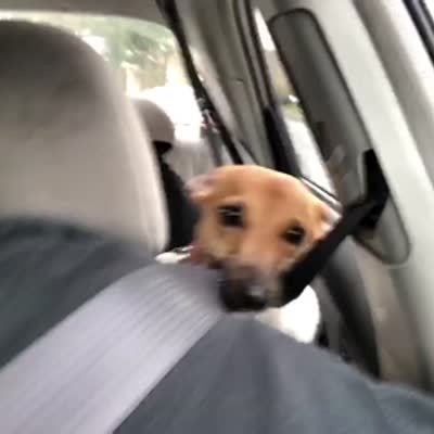 More footage of clip # 781840 (a dog pulling on his owners seat belt) Here the dog, Roo, pulls on the hood of the woman's sweater.