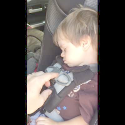 A sleeping tot boy buckles his seat belt each time the camera holder unbuckles it.