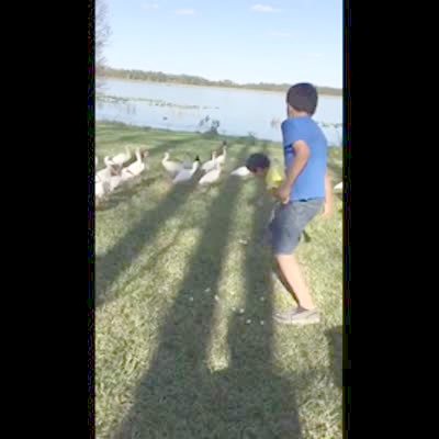 A teen boy holds a piece of bread out to a goose. The goose charges at him so he quickly backs up, right into a pole. A woman asks him if he's alright.