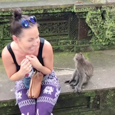 A monkey sits beside a woman. The woman hands bread to the monkey and the monkey throws the bread. The woman runs away when the monkey suddenly comes towards her.