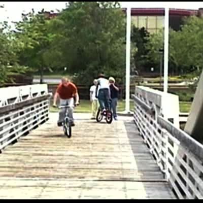 Boy jumps out from under a bridge on bike trail, he scares another boy on a bike. Scared boy falls off his bicycle, hits his groin on a wood post. The boys are cousins.