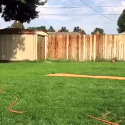 A boy runs in slow motion down a slip and slide as his brother bends backwards over the slide to make a bridge and the sliding boy crashes into his brother's groin.