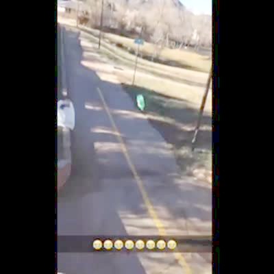 A teen boy on the top of a bridge outdoors shakes a soda bottle and throws it off the bridge. The bottle explodes and launches back and hits the boy in the gut. Snapchat