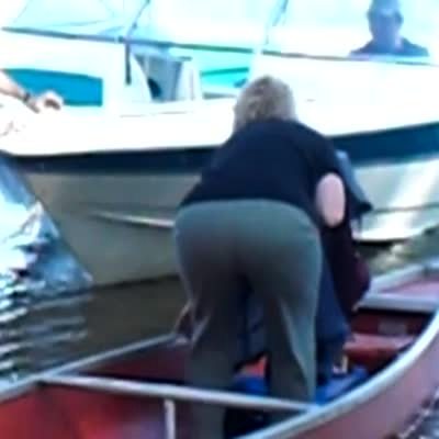 A senior woman struggles to climb into a boat from the water as her family looks on and laughs. Eventually, an adult man helps pull the senior into the boat in an awkward position.