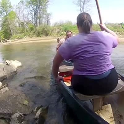 Man and woman, 2 people canoeing in a shallow river go under a tree and flip out of the canoe. Good sound.