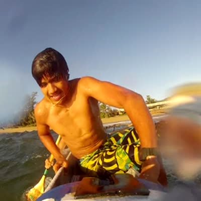 A few teens are launching a canoe in the ocean and one of the boys falls in the water at 0:19. Can cut after he falls.