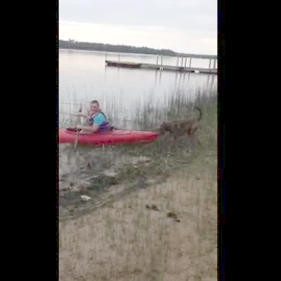 A man and a woman as well as a Yellow Lab dog ride in a canoe. From the shore, a man calls for the dog, and then tosses something into the air. The dog leaps out of the canoe and it then pitches sideways, and capsizes.