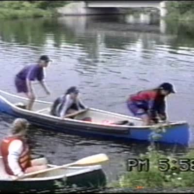 Canoe race with families on a pond. music plays over action. One of the canoers turns another couples boat over.