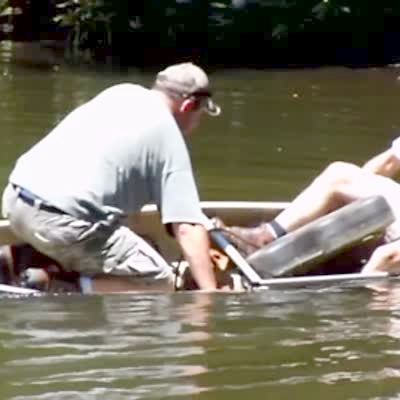 Senior man can't figure out how to get out of canoe. He tries to get up and falls into the water. Woman (filming) laughs at him. Long for edit.