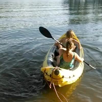 Woman tries get out of a kayak into a pontoon boat on the lake, she falls over into the water & yells. Raft, canoe.