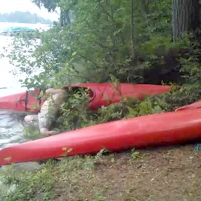 A woman tries to climb out of a kayak and on to a dock but falls backwards into a lake.