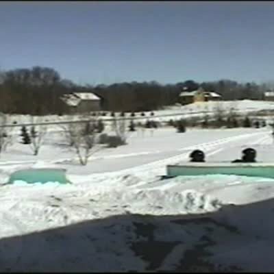 ATV pulls canoe through snow, pulls too hard and the canoe snaps in half. 2 kids are riding in the back.