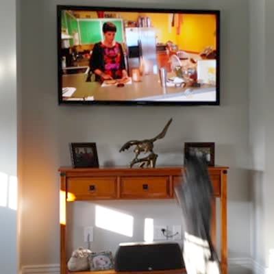 An Australian Cattle dog indoors repeatedly jumps and barks while watching AFV clips of animals jumping.