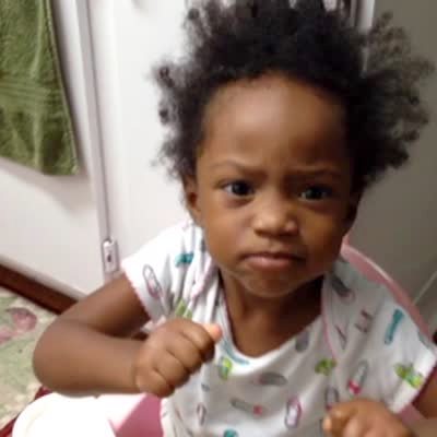 A tot girl sits in her high chair screaming a prayer before eating her cereal.