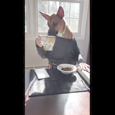 An English bulldog dog with human hands eats cereal at a table with a spoon indoors. AA: Dogs with human hands.