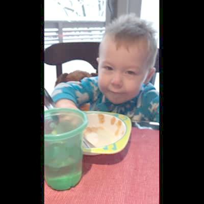 A young boy sits at a dining table and eats cereal, when he tries to put the bowl up to his mouth the milk splashes in his face and he giggles. Music rights not cleared.