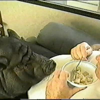 A.A. Pet Tricks. Man flicks cereal off the table toward a dog. The dog catches every piece. From several different angles.