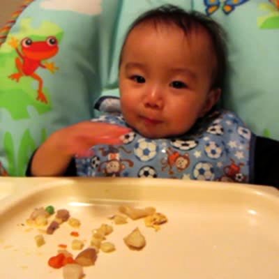 A baby boy in a highchair eats pieces of food rapidly one at a time by picking each one up and rushing it into his mouth. cereal