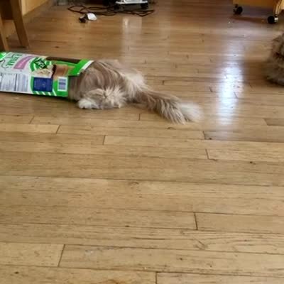 An empty cereal box lies open on the floor and a cat runs and slides into and glides across the kitchen floor.
