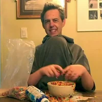 A man sleeps and snores on a bowl of cereal in a kitchen. A man shakes him awake and he stares at the camera, not amused, while a man and woman laugh.