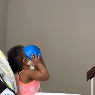 A tot girl tries to drink milk out of a cereal bowl in the kitchen, and spills the entire bowl on her face.
