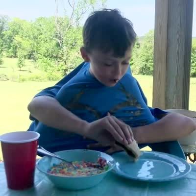 A young boy does The Borrowed Hands challenge and eats a sandwich, cereal and drinks milk in his backyard.