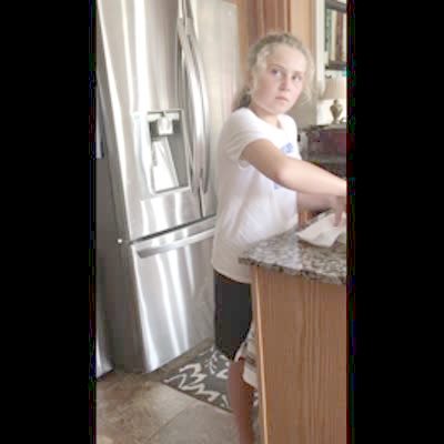 A young girl and boy dance to "Gangnam Style" in a kitchen. The girl does a handstand on a closet door, it opens, and she falls on her back. The family laughs.