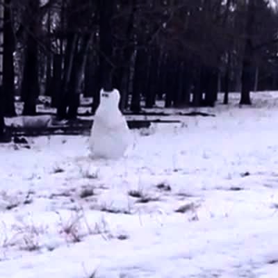 Fireworks are aimed at a snowman and they blow it up in the backyard. Winter.