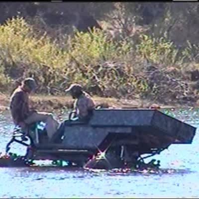 2 bonehead men in a truck try to cross river, truck leans & finally rolls upside down & men get wet.