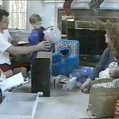Kid puts on football gear and smacks into the camera, knocking it down.