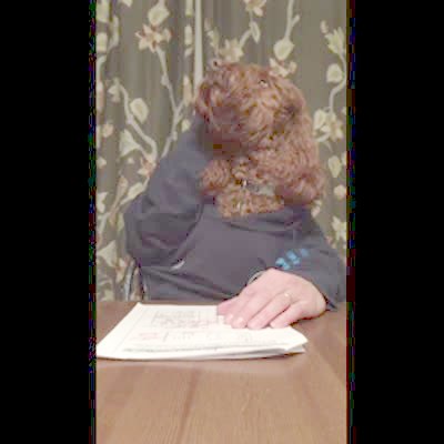 A dog with human hands sits at a table indoors and does homework.