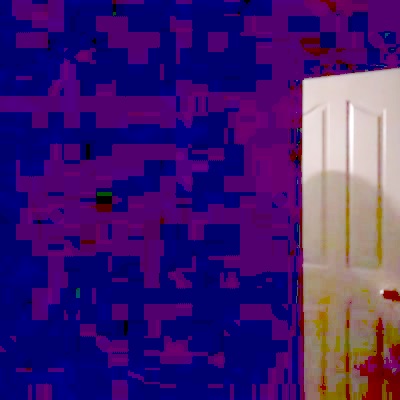 A teen girl puts a mannequin head on her head and pulls the hood of her sweatshirt over her head and dances in the bedroom. She falls backwards into a mirror and knocks it down.