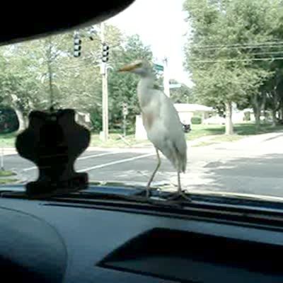 A series of clips where a large bird sits on the hood of a car and won't get off while a man drives it. In the first clip, the bird is on the hood while the man goes through a fast food restaurant drive through. The next two clips are while the man drives on the road.