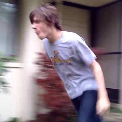 A teen boy stands in a dark room wearing a scary Halloween hood. His adult sister woman walks into the room and turns on the lights while checking her phone. After several seconds, she sees him, screams, and drops her bags. Profanity. Pranks. Short tails.