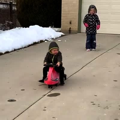 A boy stands on the hood of a power wheels car as his tot sister drives it and he falls off.