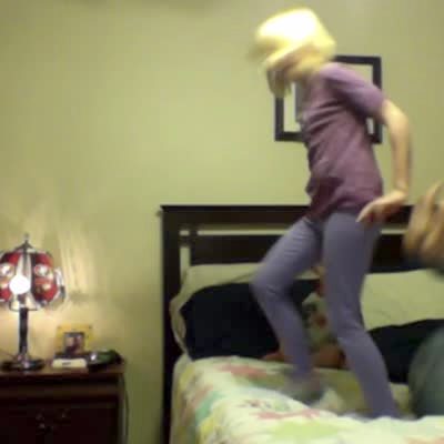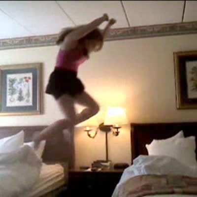 Young women jump on hotel beds, one does a flip and 2nd girl tries it. The 2nd girl flips out of frame. Falls. Bonehead.