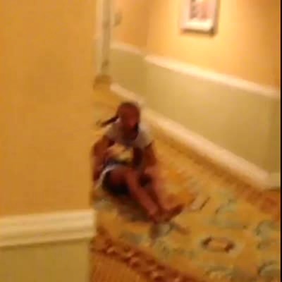 A teen girl falls on the ground after she rides a suitcase around a hotel room and it tips over.