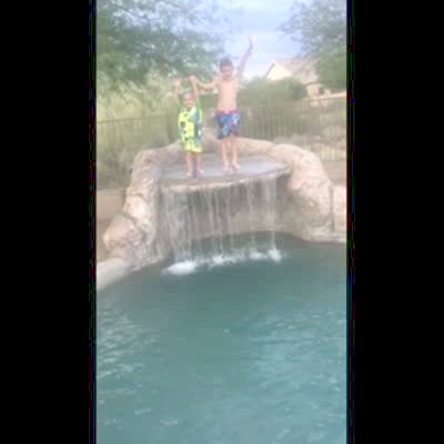 A young boy and his tot brother hold hands and jump into a swimming pool and the boy jumps in on the count of three but the tot does not but his brother pulls him into the water with him.