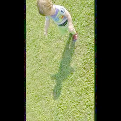 A tot boy chases his shadow and babbles to his father that he wants to give it a hug before he lies in the grass and hugs the ground.
