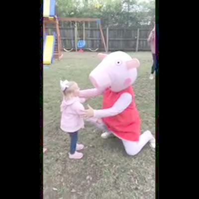 A tot girl hugs a woman in a Peppa Pig costume and the head of the costume comes off in the backyard.